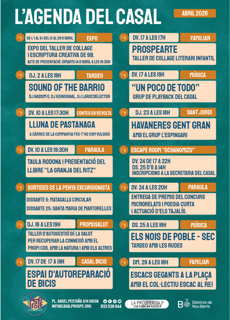 Aquí teniu tota la programació del Casal pel mes d’abril: “tardeos” musicals, un Escape Room, activitats per Sant Jordi… I molt més!. Guardeu-vos les dates!