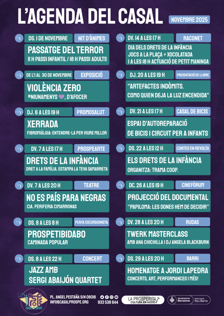 Aquí us deixem tota la programació del Casal per al mes de novembre: Nit d’Ànimes, activitats al voltant del 25N, xerrades, espectacles familiars, teatre, sortides a la muntanya, concerts, presentacions de llibres, taller de bicis, exposicions i molt de barri!