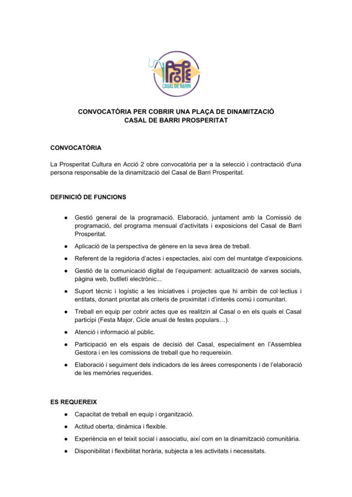La Prosperitat Cultura en Acció 2 obre convocatòria per a la selecció i contractació d’una persona responsable de la dinamització del Casal de Barri Prosperitat.
